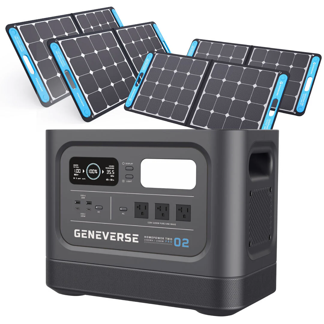 The Geneverse HomePower TWO PRO is a 2419Wh (2200W/4400W Surge) LiFePO4 power station. Like all Geneverse power stations, it is indoor safe and solar-capable, compatible with Geneverse’s 200W SolarPower 2: All-Weather Portable Solar Panels.